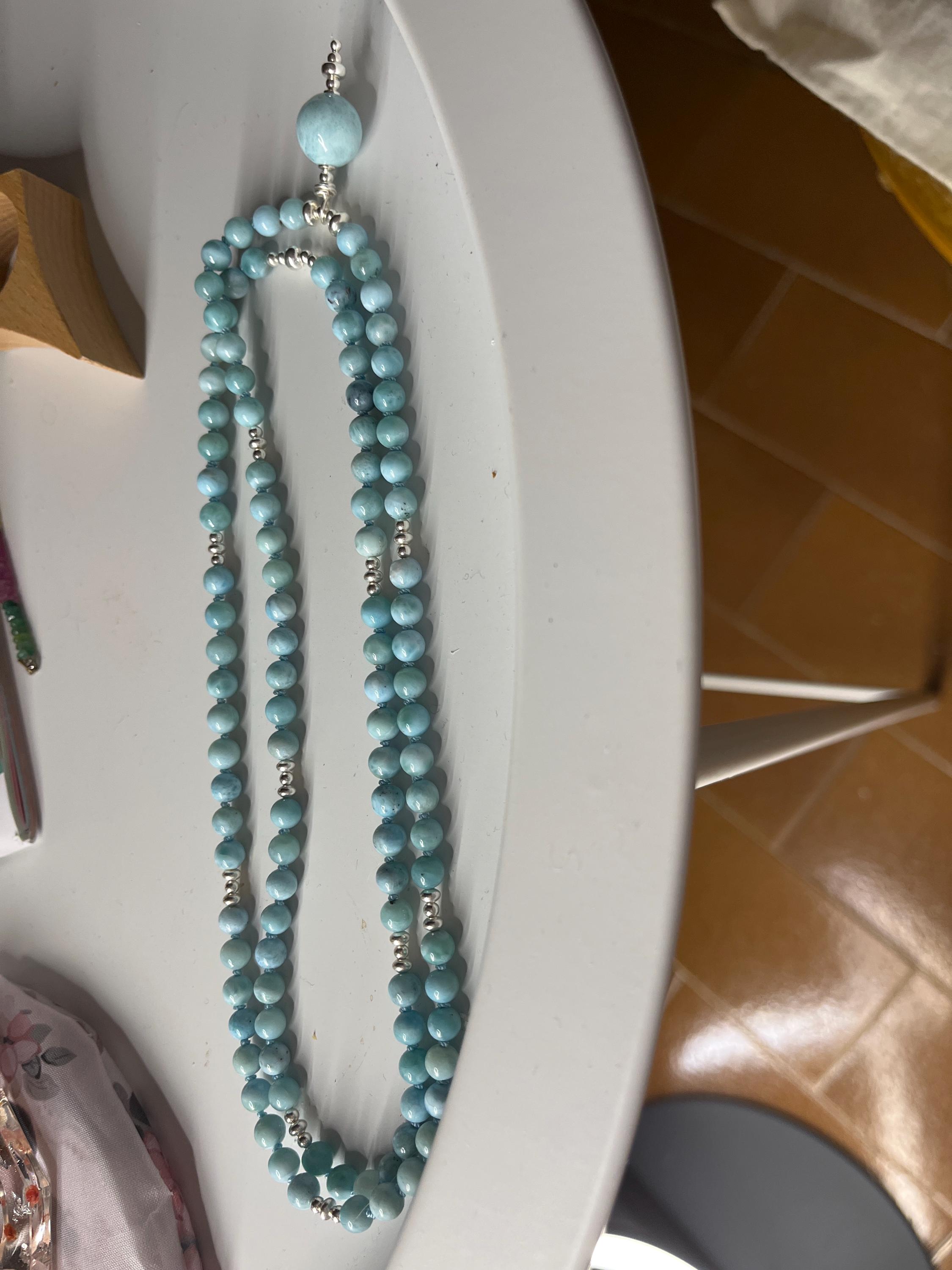 Gemstones are said to have special healing properties. Larimar is a very special stone. It is only mined in the Dominican Republic and its abundance is decreasing. Larimar is also called the Atlantis stone and is said to have great healing properties. I feel that this mala has to do with the qualities of healing, opening and light and can possibly support you accordingly.